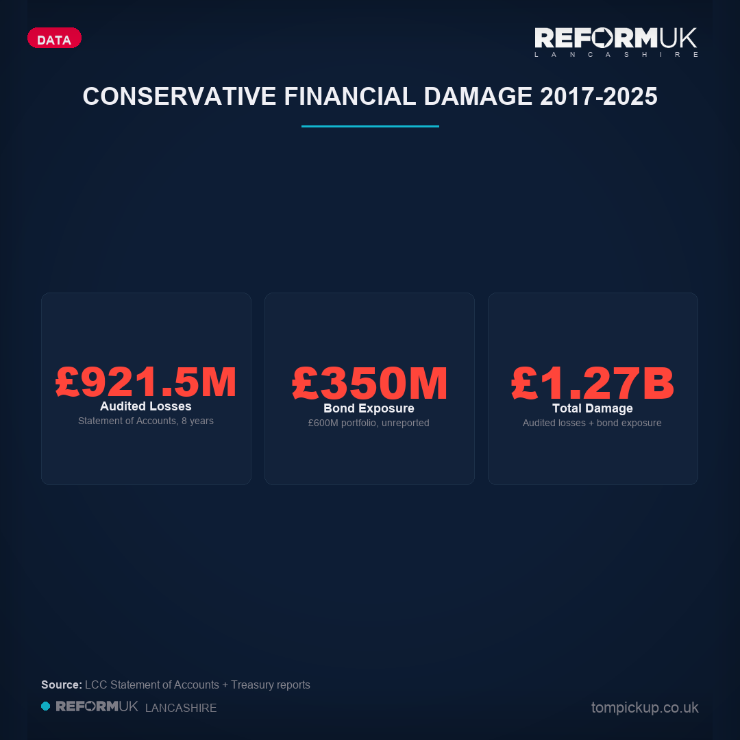 Over eight years, the Conservatives presided over £921.5 million in documented losses. That figure comes from the council’s own audited Statement of Accounts, 2017/18 to 2024/25: