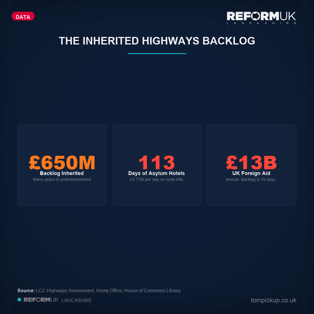 The Conservatives left Lancashire with a £650 million highways maintenance backlog. That figure comes from the council’s own highways condition assessment.